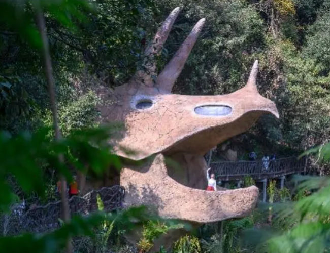 当游客闯进“古龙秘境”,便如化身为穿越时空的探险家,开启一场扣人心弦的冒险、奇幻之旅,沿着古朴原始的森林栈道漫步时,恐龙化石、水帘洞天、蚂蚁城堡、散布在水岸的恐龙、桫椤、食人花,放养在河谷的巨型鱼类,霸王龙、三角龙、翼龙等近百种不同种类的史前巨兽“生活”于秘境之中,或仰天嘶吼,或低头觅食,或亲昵互动,仿佛拉开了史前森林大幕,或与恐龙并肩同行,或探秘史前巨兽的隐秘巢穴。