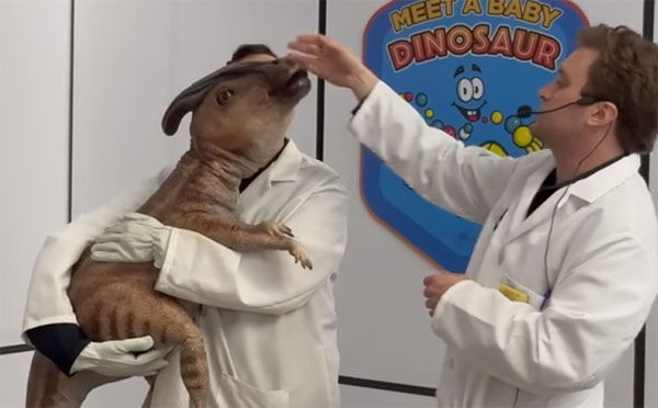 (1).游客进入到孵化小恐龙的操作间里,演员抱着嗷嗷待哺的副栉龙小宝宝出来。演员操作恐龙宝宝的嘴巴啼叫和小脑袋晃动,像是在跟现场的游客要食物一样。其中抱着副栉龙宝宝的演员可以现场讲解小恐龙的孵化知识,并让现场的小朋友摸一摸恐龙小宝宝。