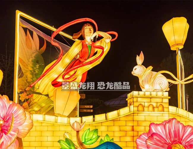 嫦娥可以说是咱们中国最为知名的仙女之一了!她身材曼妙,貌美如花,误食仙药后飞升到了月亮之上,成为了守护月亮的仙子。这么有美感和寓意的故事,当然也不会错过成为常见的彩灯灯组了。